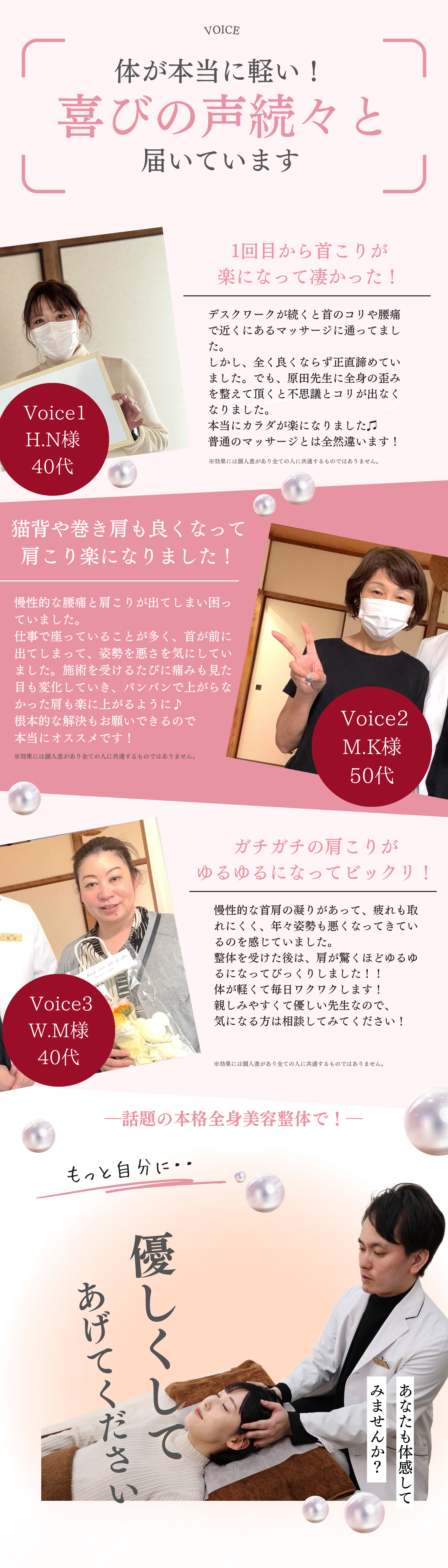 ボキボキしないギューギューしない、ソフトな施術なのに変化を実感できます。